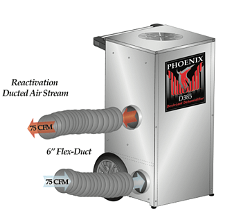 The Phoenix D385 is easy to transport and set-up and fits in areas already designed for your LGRs and will move on to the jobsite with the same portability. All the power to the unit is provided by two 230 volt grounded power cords. Simply plug the cords into separate 10 amp outlets. Each cord draws only 5.5 amps to power the D385. The re-activation air stream is ducted through 15.25cm (6") flex duct provided with the unit and stores conveniently in the top of the unit.
