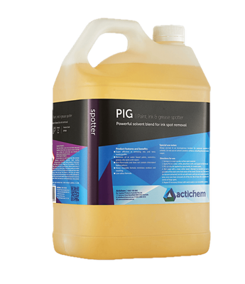 Super strength blend of powerful polar and non-polar solvents for removing tough oily soils, grease and ink. Actichem PIG is a fast-acting solvent blend that quickly removes tough soils from carpets and upholstery. You will also find this product to be very effective on shoe polish, marking pen and oxidised oils and grease.