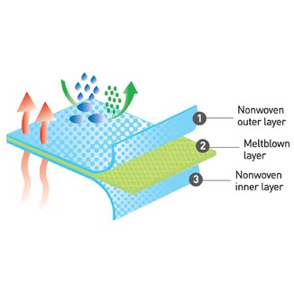 - A layer of melt blown polypropylene is sandwiched between 2 layers of spun bond polypropylene to produce a 50GSM fabric that allows moisture vapour to escape while protecting against airborne particles and liquids.